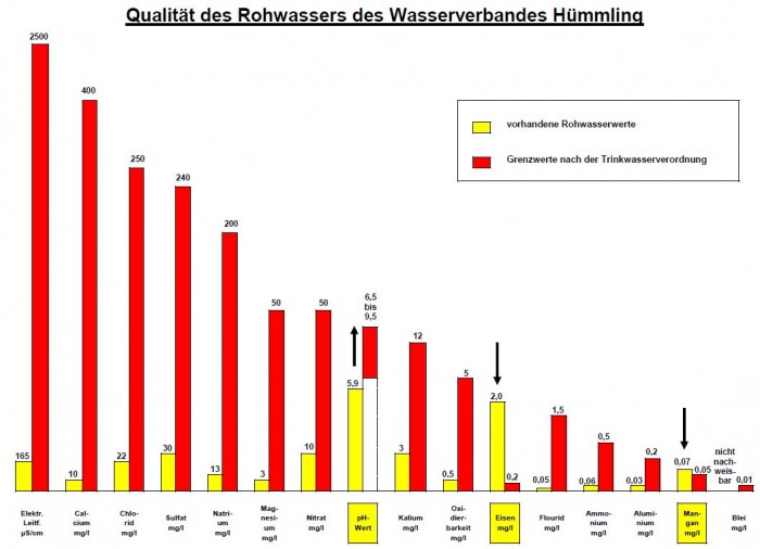 Anhand des nachfolgenden Diagrammes (Auszug) ergibt sich die Aufbereitungsnotwendigkeit des hiesigen Rohwassers (= Grundwasser in der Entnahmetiefe) für die Parameter Eisen, Mangan und für den pH-Wert. Hinsichtlich der übrigen Parameter ist ersichtlich, dass diese im Rohwasser bereits i.d.R. weit unterhalb des Grenzwertes liegen und insofern eine Aufbereitung hierzu nicht erforderlich ist.