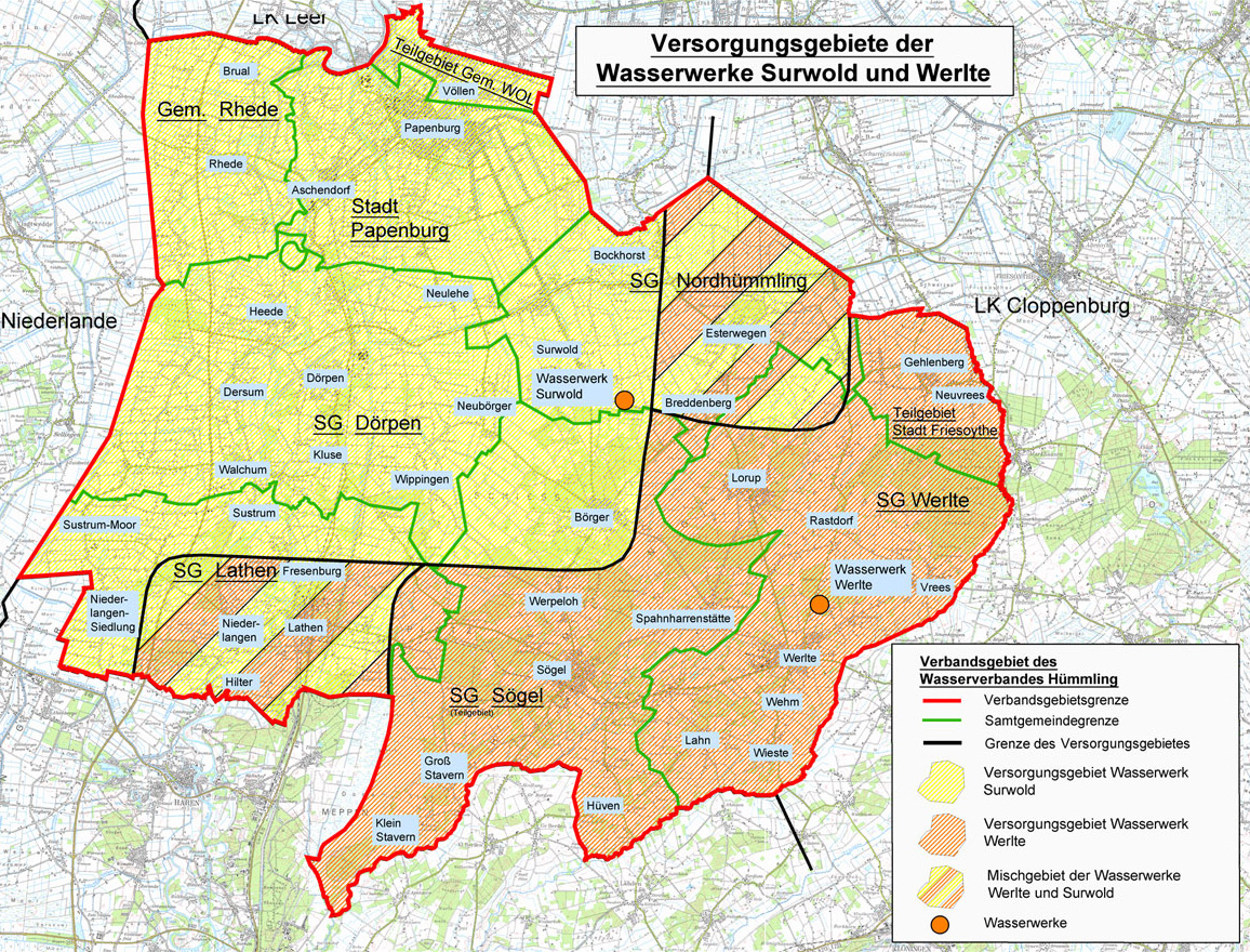 Das Rohwasser wird zur Aufbereitung in den Wasserwerken Werlte und Surwold als erstes über eine Filteranlage geleitet, die die im Wasser enthaltenen gelösten Eisenanteile reduziert (Enteisenung). Bei Bedarf wird dem Rohwasser vorher Luftsauerstoff zugeführt. Anschließend wird das Wasser über eine Kaskade geführt, die dem Wasser freies CO2 entzieht und gleichzeitig erneut Sauerstoff zuführt.