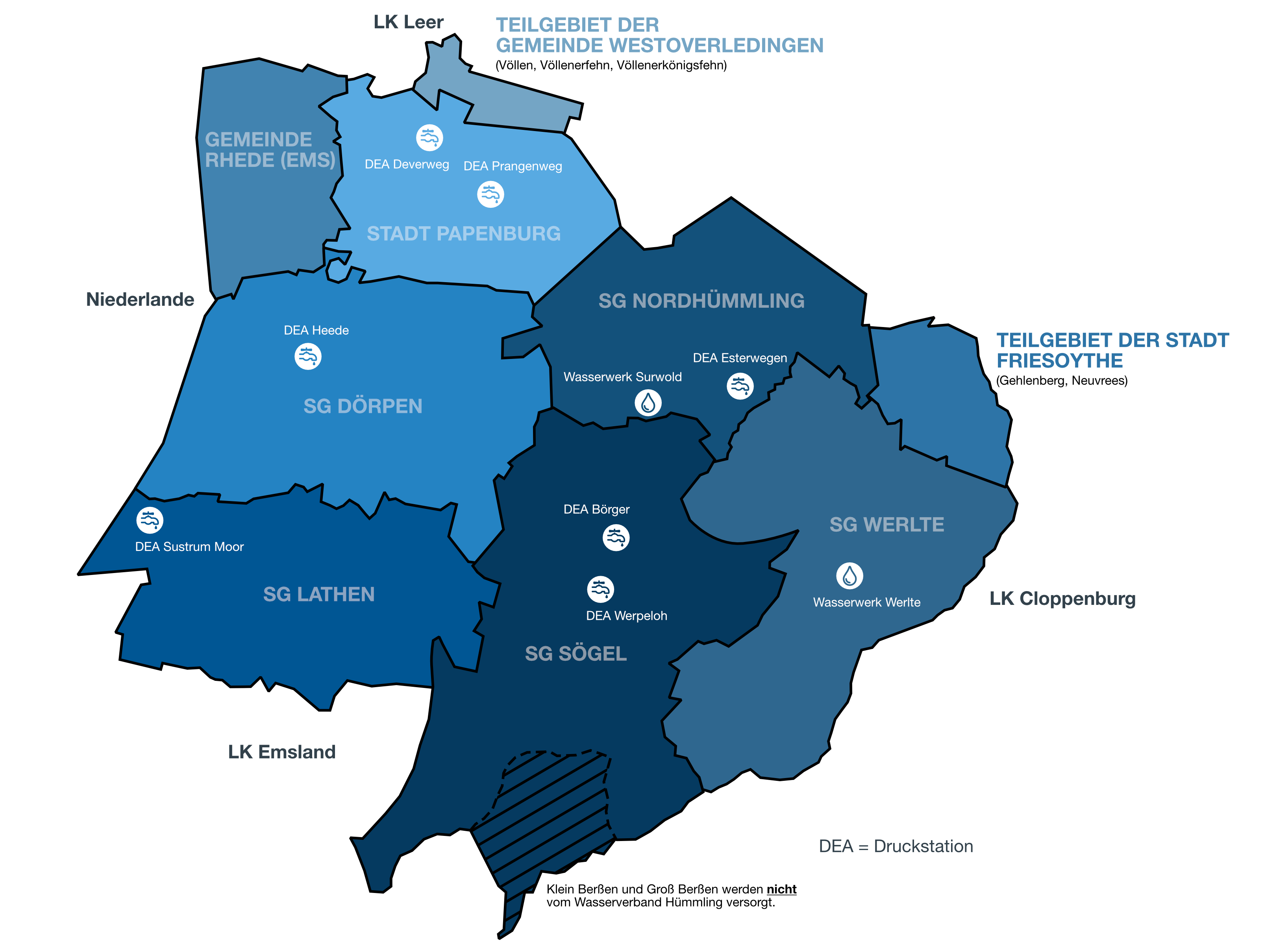 Der Wasserverband Hümmling betreibt die öffentliche Wasserversorgung im nördlichen Teil des Landkreises Emsland und in kleineren Teilgebieten benachbarter Landkreise. Der Verband beschafft Rohwasser, bereitet es zu bestem Trinkwasser auf und verteilt es anschließend über ein weit verzweigtes Leitungsnetz und zahlreiche Hausanschlüsse direkt an seine Kunden bis hin zum Zapfhahn.