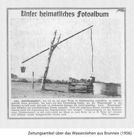 „Eine „Hebelbaumpütte“, wie wir sie auf einer Weide im Südhümmling entdeckten, ist außerordentlich selten geworden. Sie kann nur dort Verwendung finden, wo der Wasserspiegel in den Brunnen so hoch steht, daß auch im trockensten Sommer die verhältnismäßig kurze „Eimerstange“ zum Schöpfen des unentbehrlichen Nasses ausreicht. Trotz der primitiven Bauart erfordert die Handhabung durch die Ausnutzung des Gegengewichtes weit weniger Kraftanstrengung als das Bedienen eines „Drehbrunnens“, in den nicht selten Eimer an einer Kette bis zu 20 Meter tief versenkt und mühsam wieder hochgewunden werden muß.“